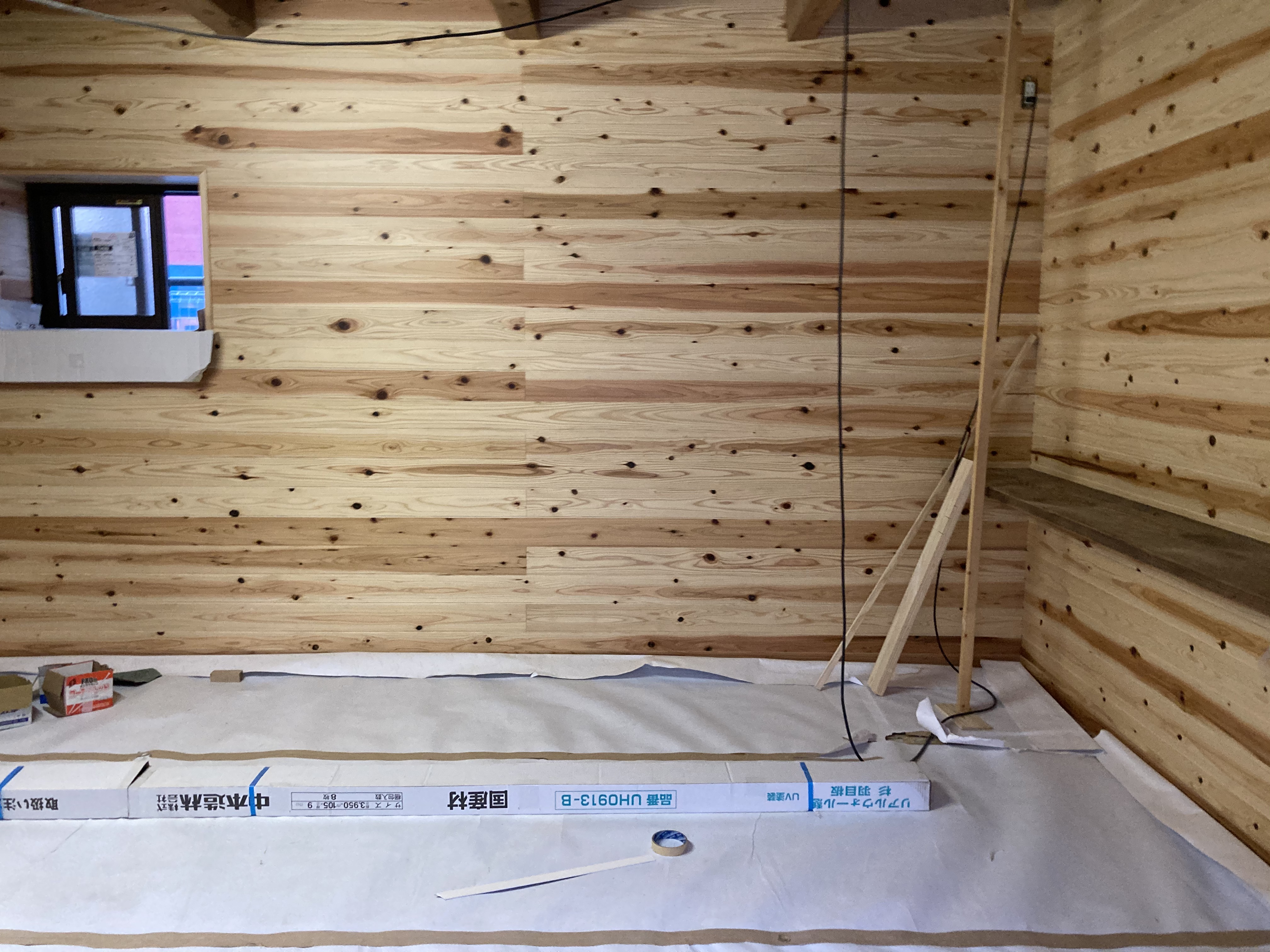 今回は床、壁、天井にお客様のご要望で杉板を施工。