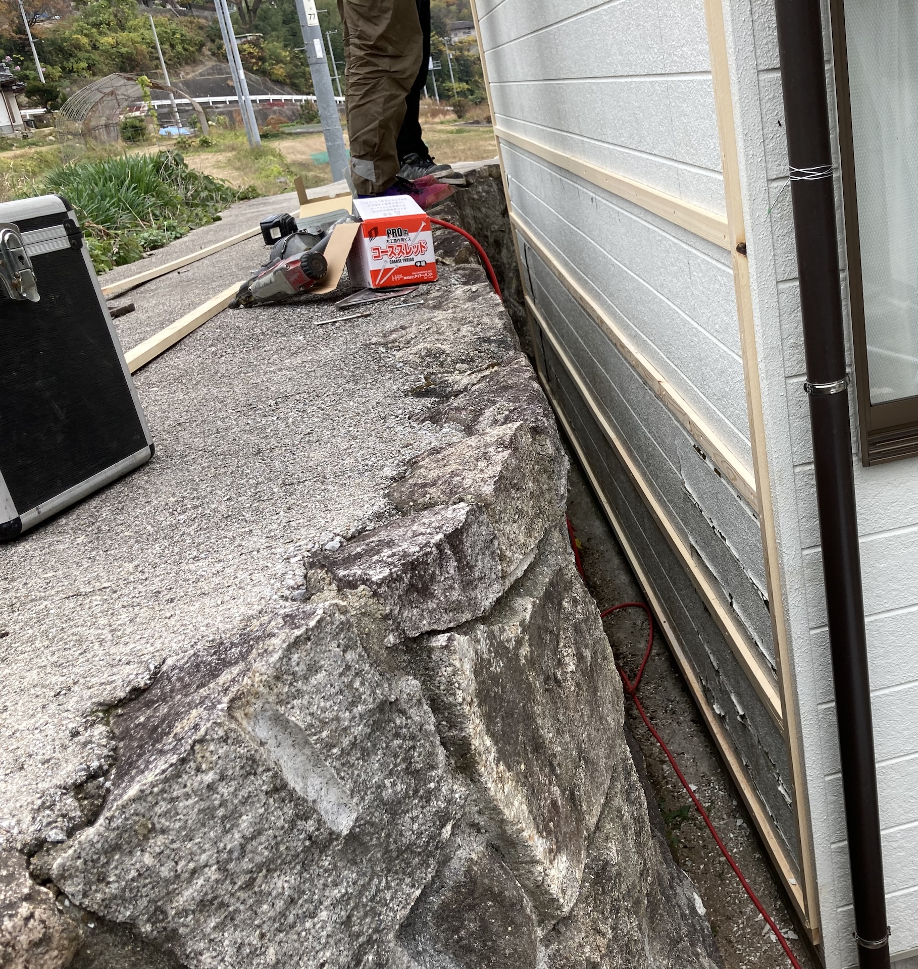 経年的に劣化したサイディング外壁に下地を施し、新たに木目調のトタンを張っていきました。