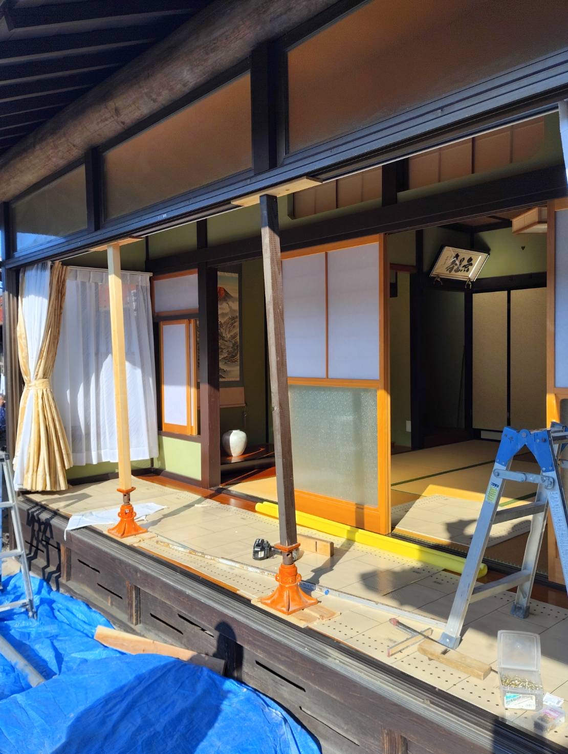 少しずつジャッキで突いて鴨居ごと押し上げます。