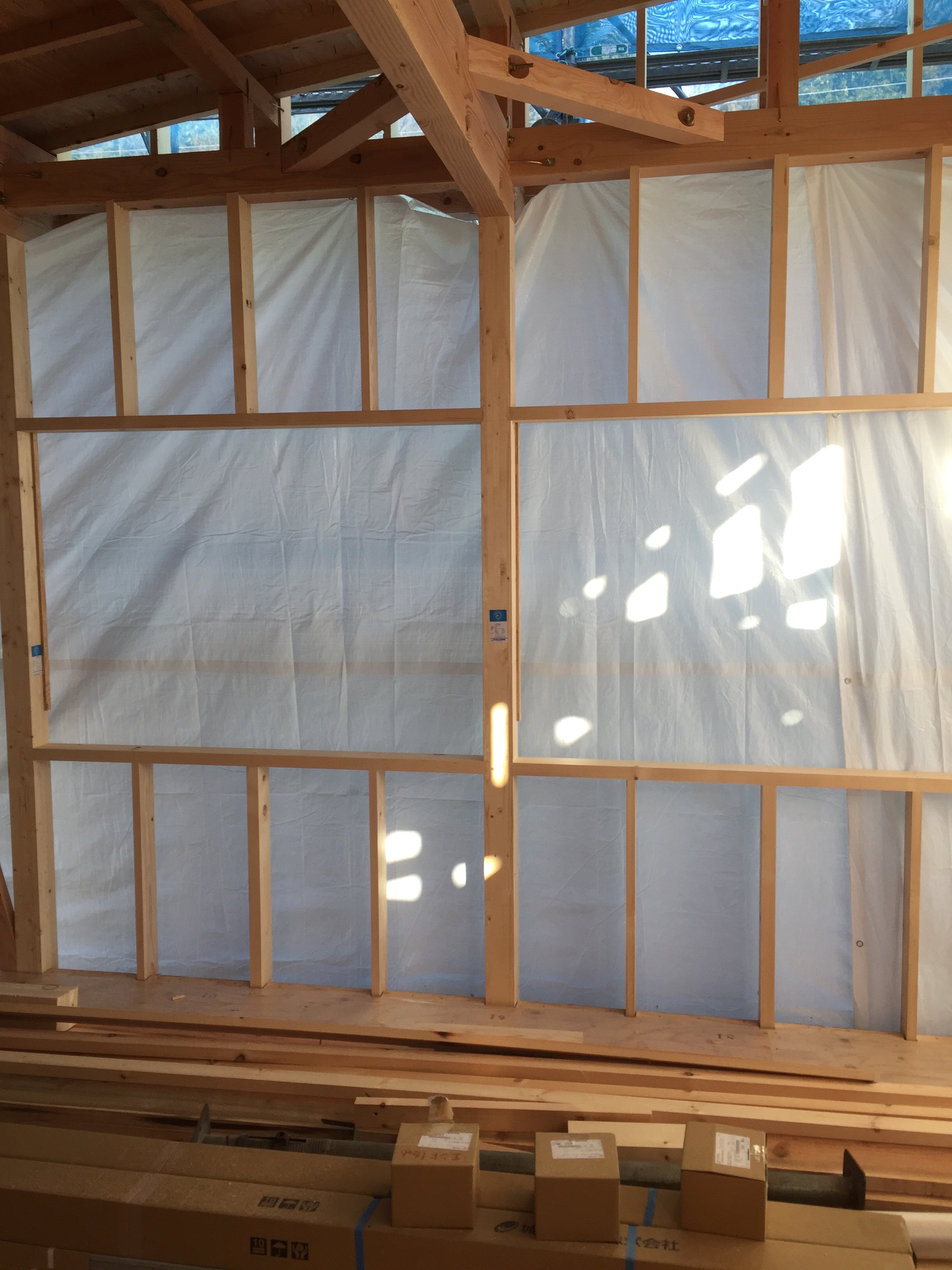 古材のある家 可部も上棟が終わり大工工事、屋根工事などが順調に進んでいます。